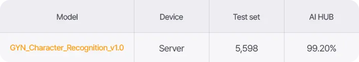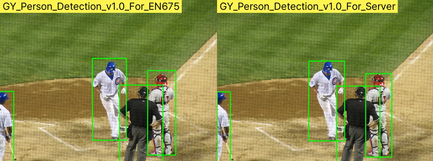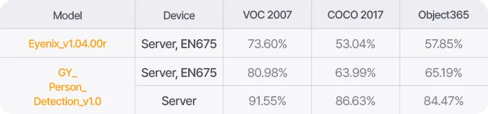 현재 Server 타입의 모델은 Classification, Semantic segmentation 두 가지 모델이 있기 때문에 Detection 모델인 EN675타입과의 비교가 불가하여 기재하지 않았습니다.