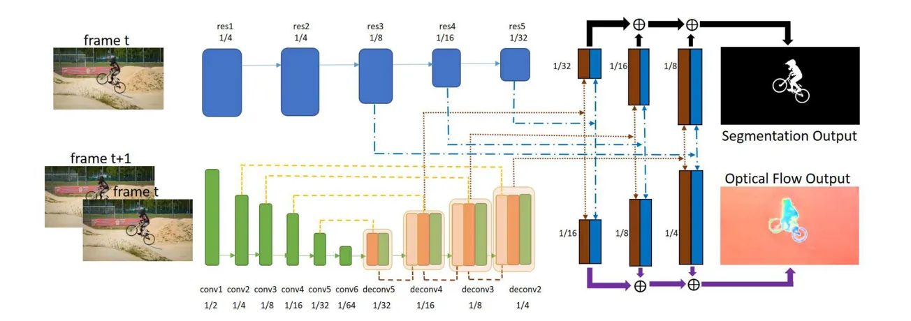 위 접근법의 경우 seg 네트워크와 FlowNet이 서로를 도울 수 있다는 아이디어로 제안되었습니다. seg네트워크에 추가 브랜치로 FlowNetS라는 네트워크를 추가하여, seg모델을 업데이트하고, 이후 optical flow network를 업데이트함으로써 일관성을 개선합니다.