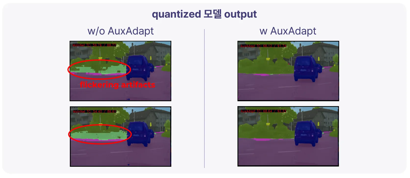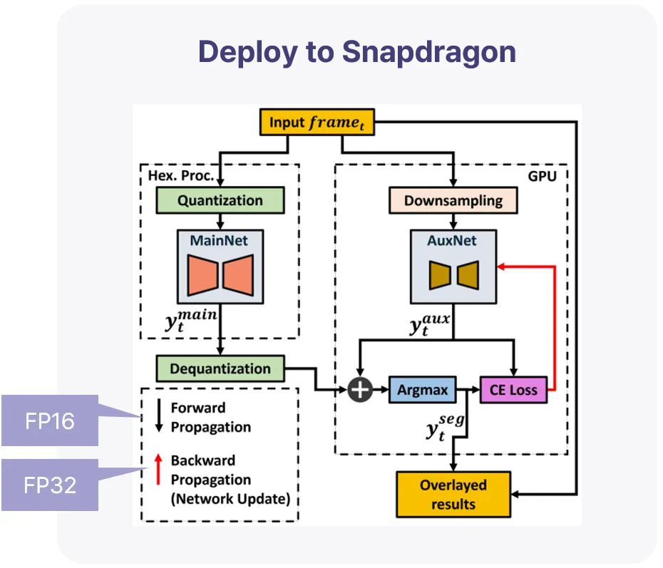 비교적 많은 연산이 필요한 MainNet을 Hexagon 프로세서에서 실행하고, 작은 보조 네트워크인 AuxNet을 GPU에서 실행합니다. 모바일 구동을 위해 MainNet은 Qualcomm의 AIMET에 의해 Quantization됩니다. AuxNet은 Quantization되지 않으며, test-time 때 업데이트됩니다.(업데이트 시 OpenCL ML SDK 활용) 이 때 추론은 빠른 연산을 위해 FP16으로, 정확성을 위해 업데이트는 FP32로 수행됩니다.