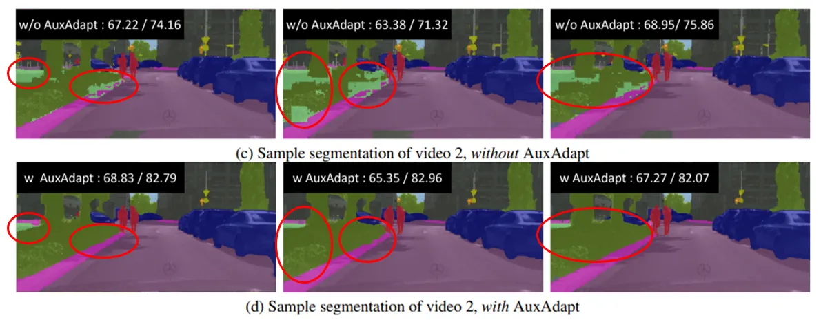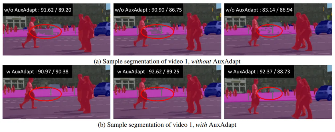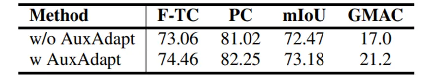 이전 접근법의 경우 큰 연산량이 요구되는 temporal features를 사용하여 모바일 적용이 어려웠습니다. 반면, AuxAdapt는 적은 연산량 추가만을 요구하기에 모바일 기기에 도입이 가능합니다.