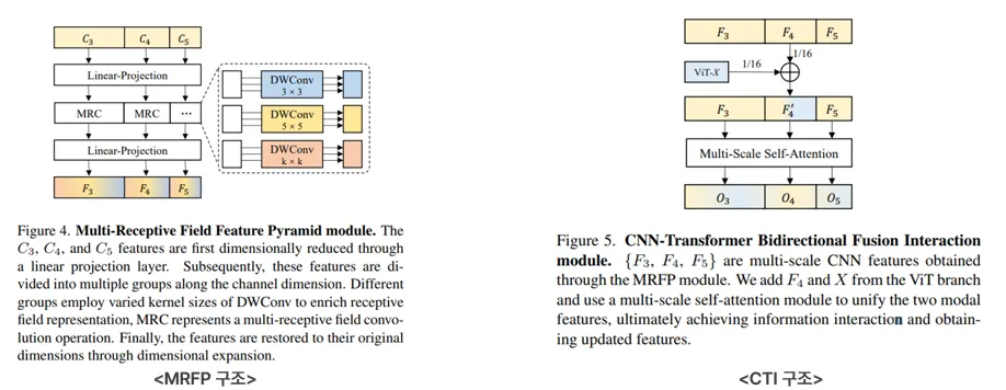 MRFP (Multi-Receptive Field Feature Pyramid module)와 CTI (CNN-Transformer Bidirectional Fusion Interaction module)를 제안하여 CNN feature와 Transformer feature 결합하여 사용합니다.