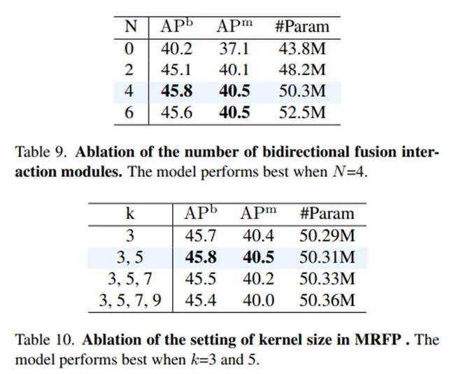 Table 9 : Interaction Modules (MRFP + CTI) 구조를 반복한 회수에 따른 성능으로 N이 증가한다고 계속 성능이 높아지진 않습니다.