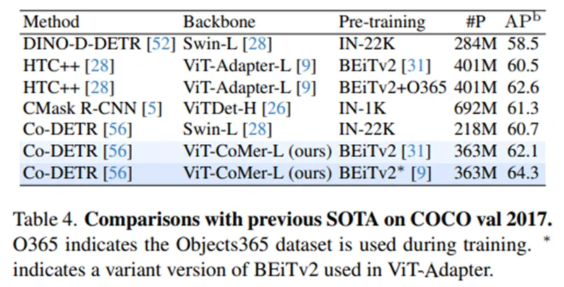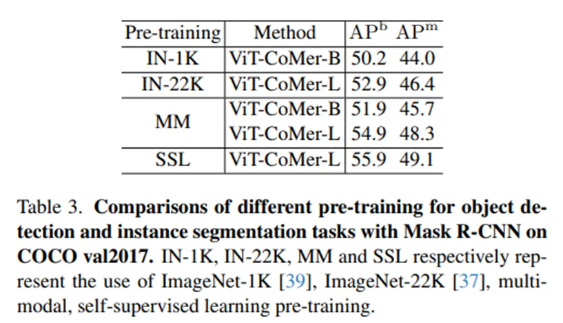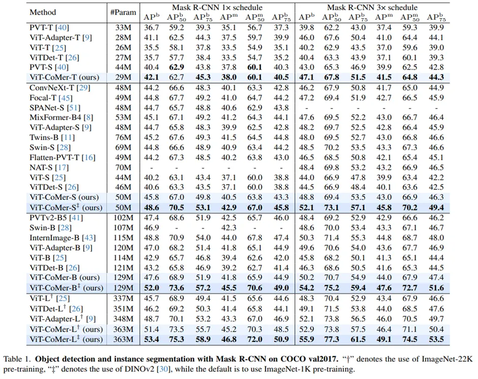 Object Detection과 Instance Segmentation에서 제안한 ViT-Comer가 ViT에 비해 성능이 훨씬 높습니다.