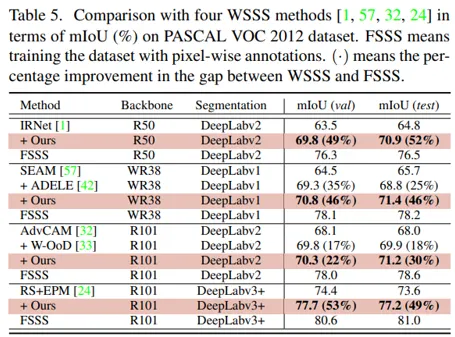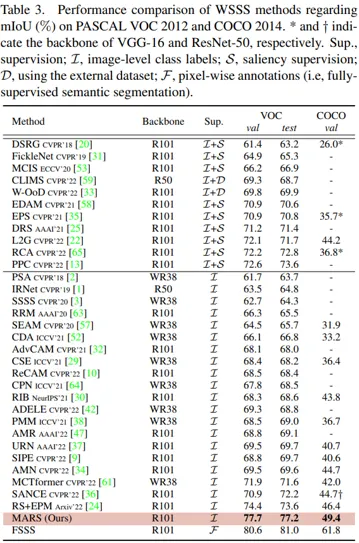 MARS를 활용하여 학습한 네트워크는 현존하는 다른 모든 WSSS 모델들과 비교하였을 때 가장 높은 성능을 보여줍니다.