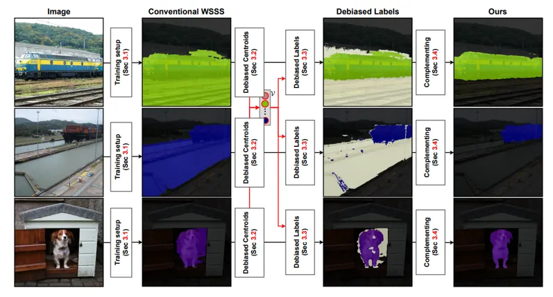 예를 들어 WSSS가 ‘train’이라는 태그를 가지고 기차를 학습할 때, 학습 데이터 상의 기차는 대부분 선로 위에 있기 때문에 선로까지 함께 기차라고 학습하는 문제입니다.