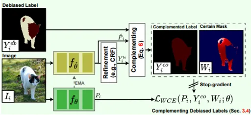 debiased label에서 잘못 예측되었던 부분을 teacher network의 output으로 채워넣어 complemented label을 만들어 학습합니다.