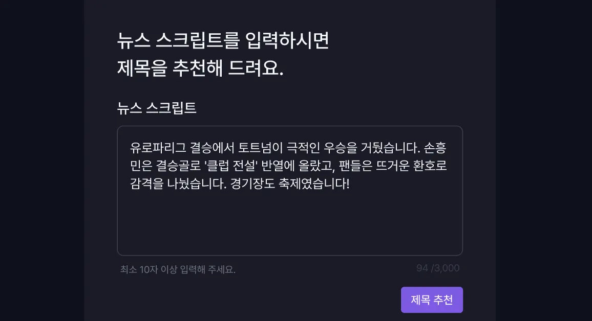 스크립트를 입력하면 자동으로 추천 뉴스 제목이 생성됩니다.