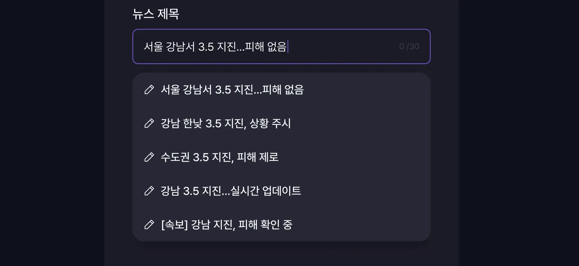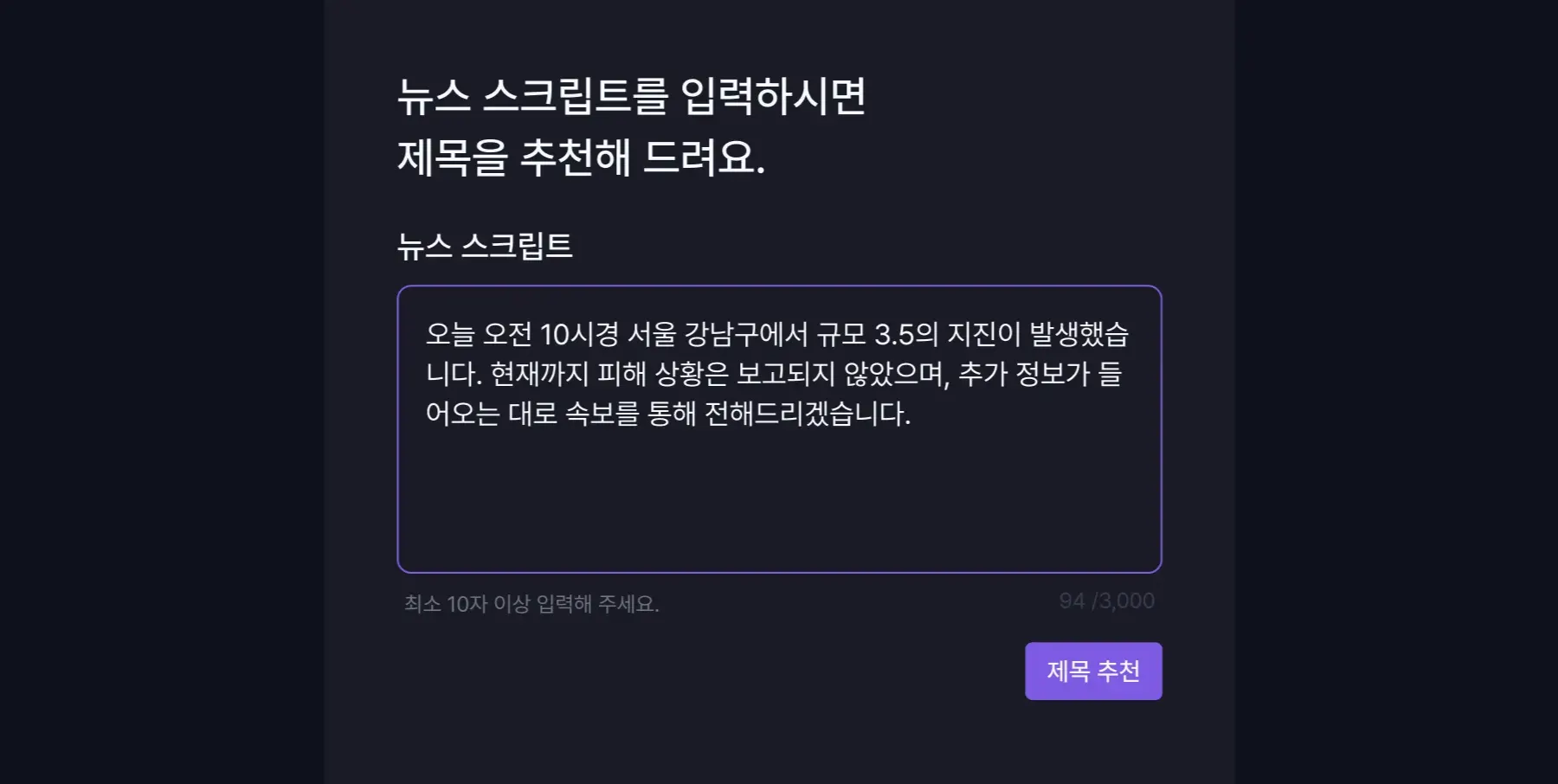 스크립트를 입력하면 추천 뉴스 제목이 자동으로 생성됩니다.