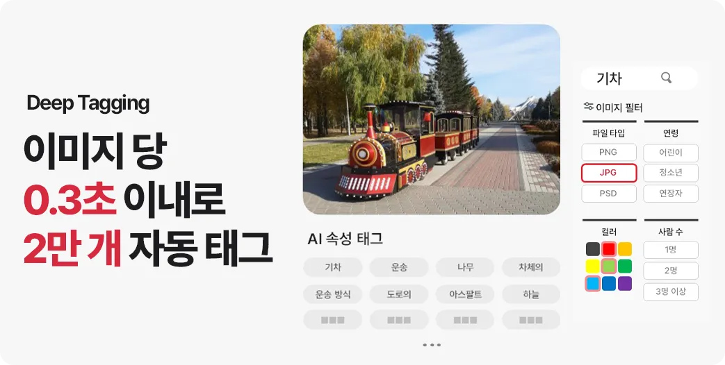 1) AI가 이미지당 0.3초 이내로 2만개의 이미지 속성을 자동 추출하여 키워드를 제공합니다.