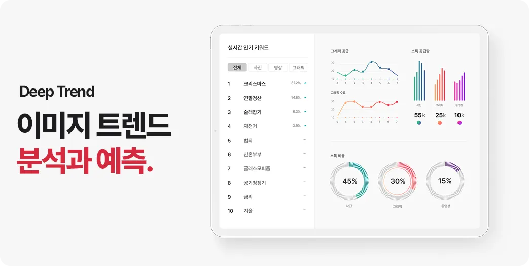 스톡 사이트 내 인기 이미지에서 도출한 키워드 결과를 기반으로 분석, 예측합니다.