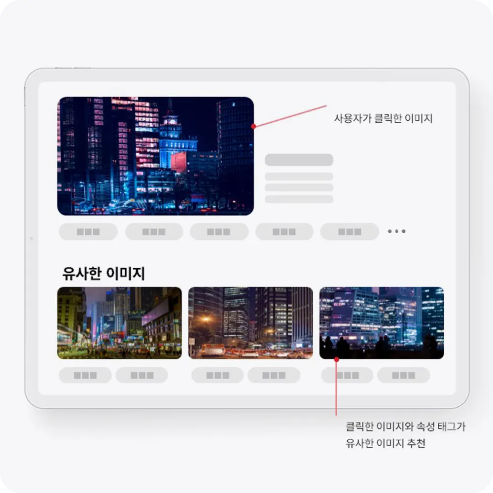 1) 사용자가 보고 있는 이미지 또는 클릭한 이미지와 유사한 이미지를 AI가 자동으로 추천합니다.