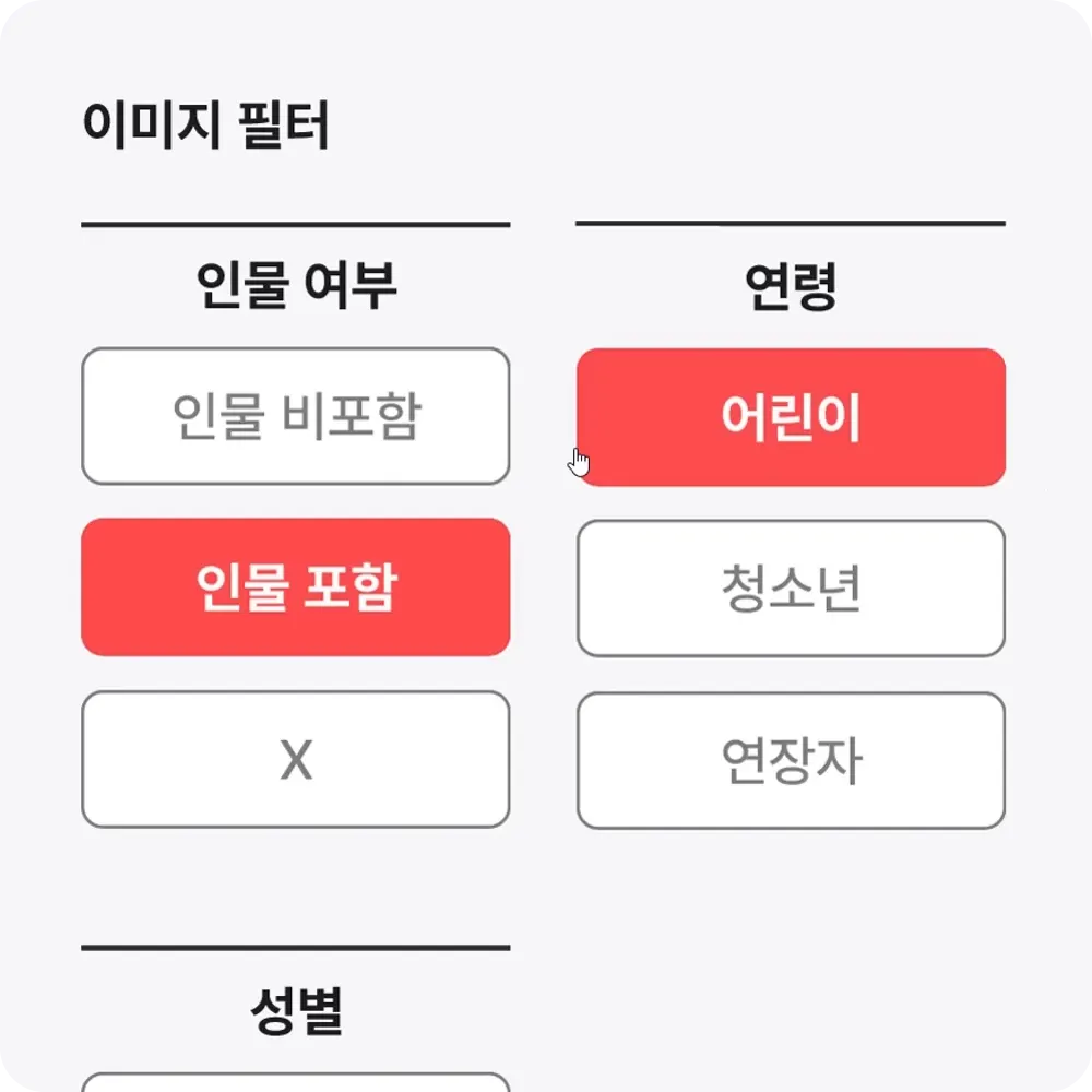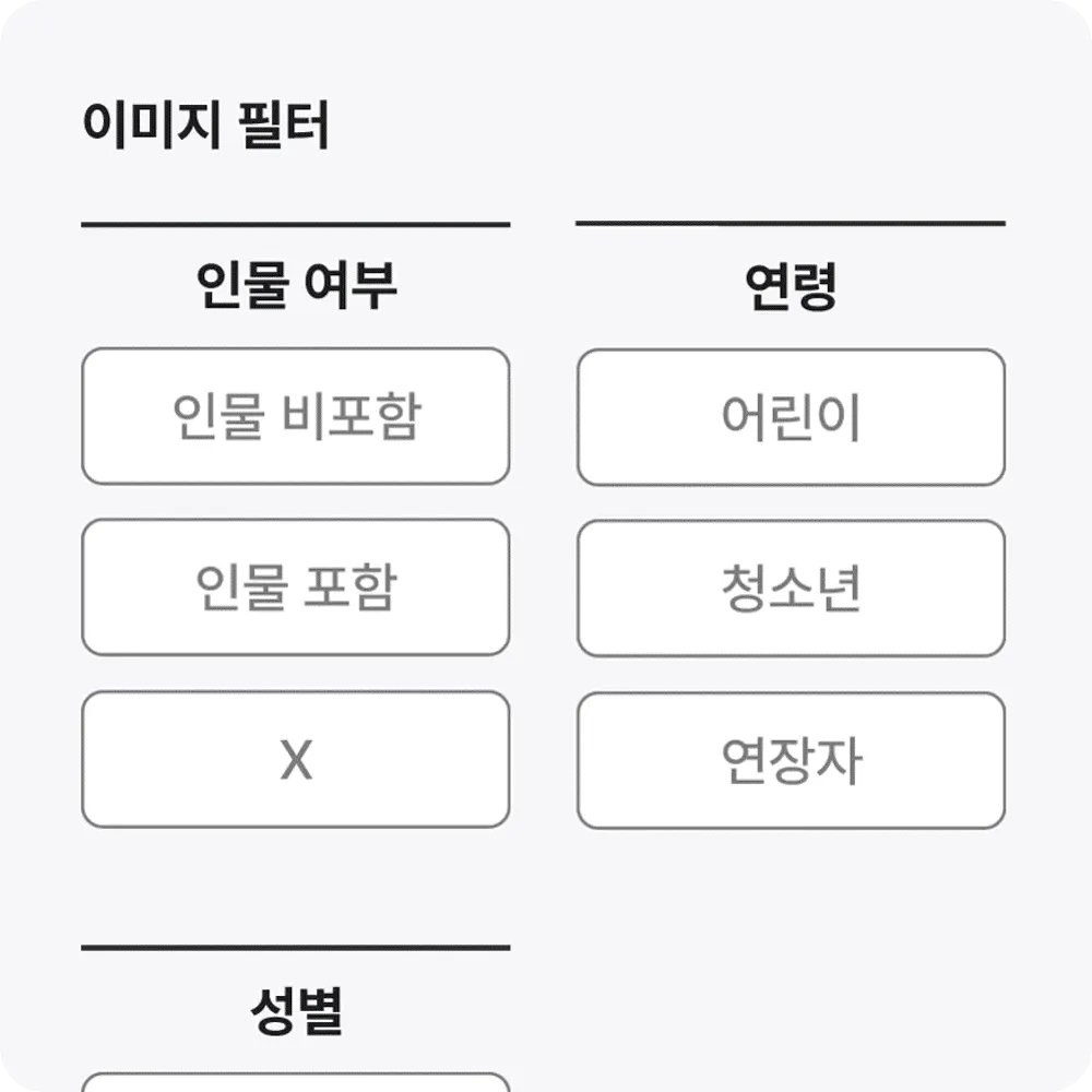 사람을 찾을 땐 인물포함, 연령, 성별 등의 세부 카테고리를 제공합니다.