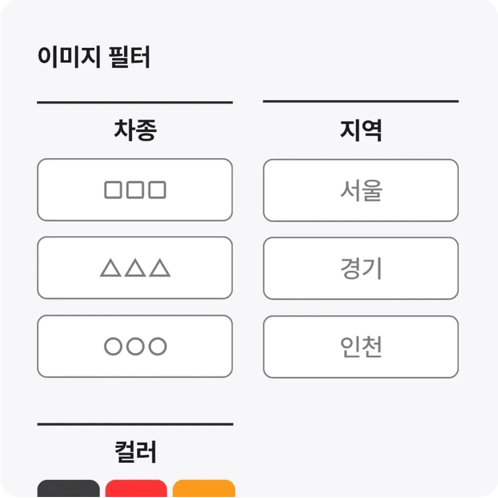 차량을 찾을 땐 색상, 모델명, 지역 등의 세부 카테고리를 제공합니다.