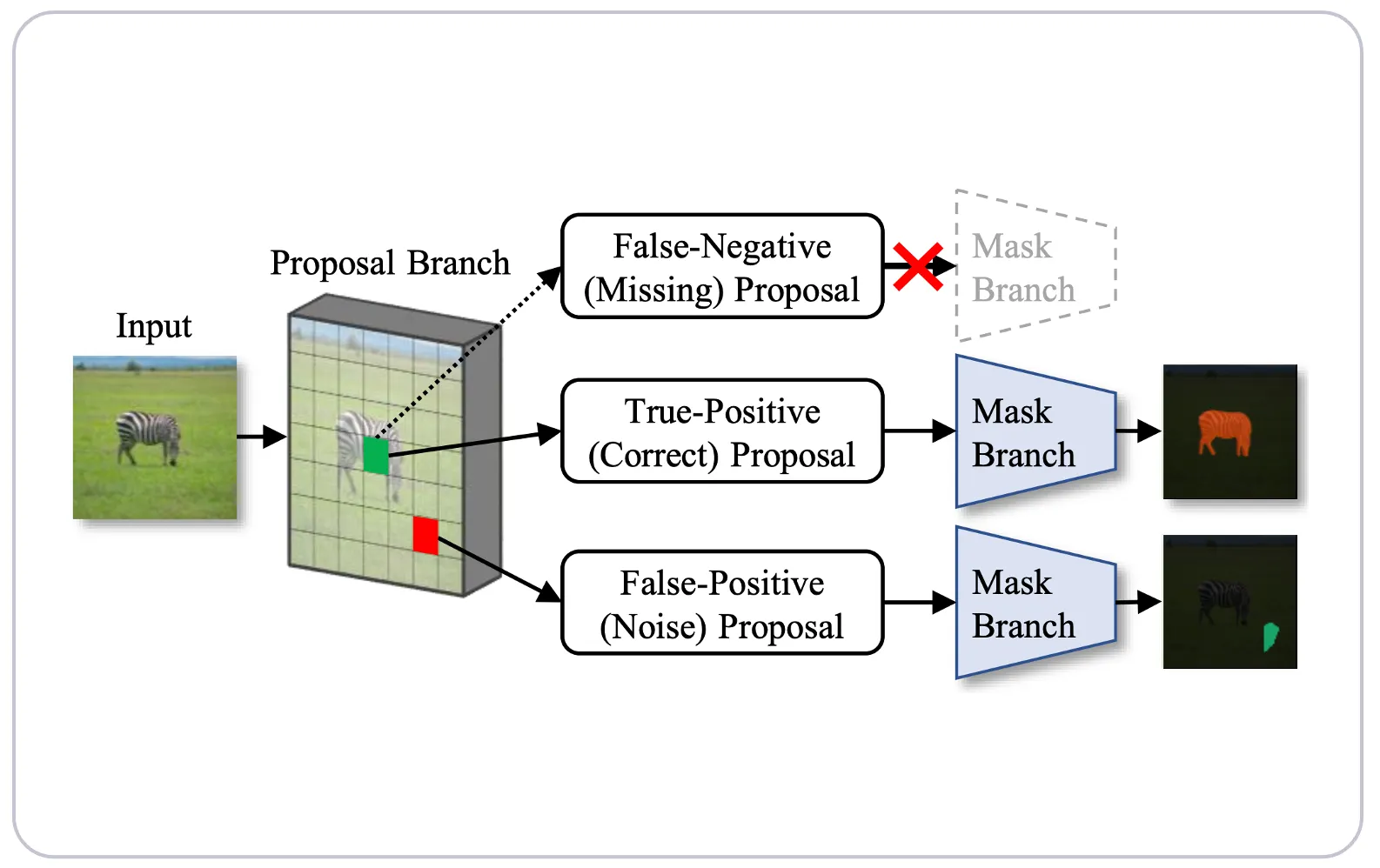 이러한 구조로 인해, Mask Branch의 성능이 우월하더라도, Proposal이 없거나 잘못된다면 그에 준하는 성능을 낼 수 없습니다. 즉, Proposal branch에서 병목이 발생하는 것입니다.