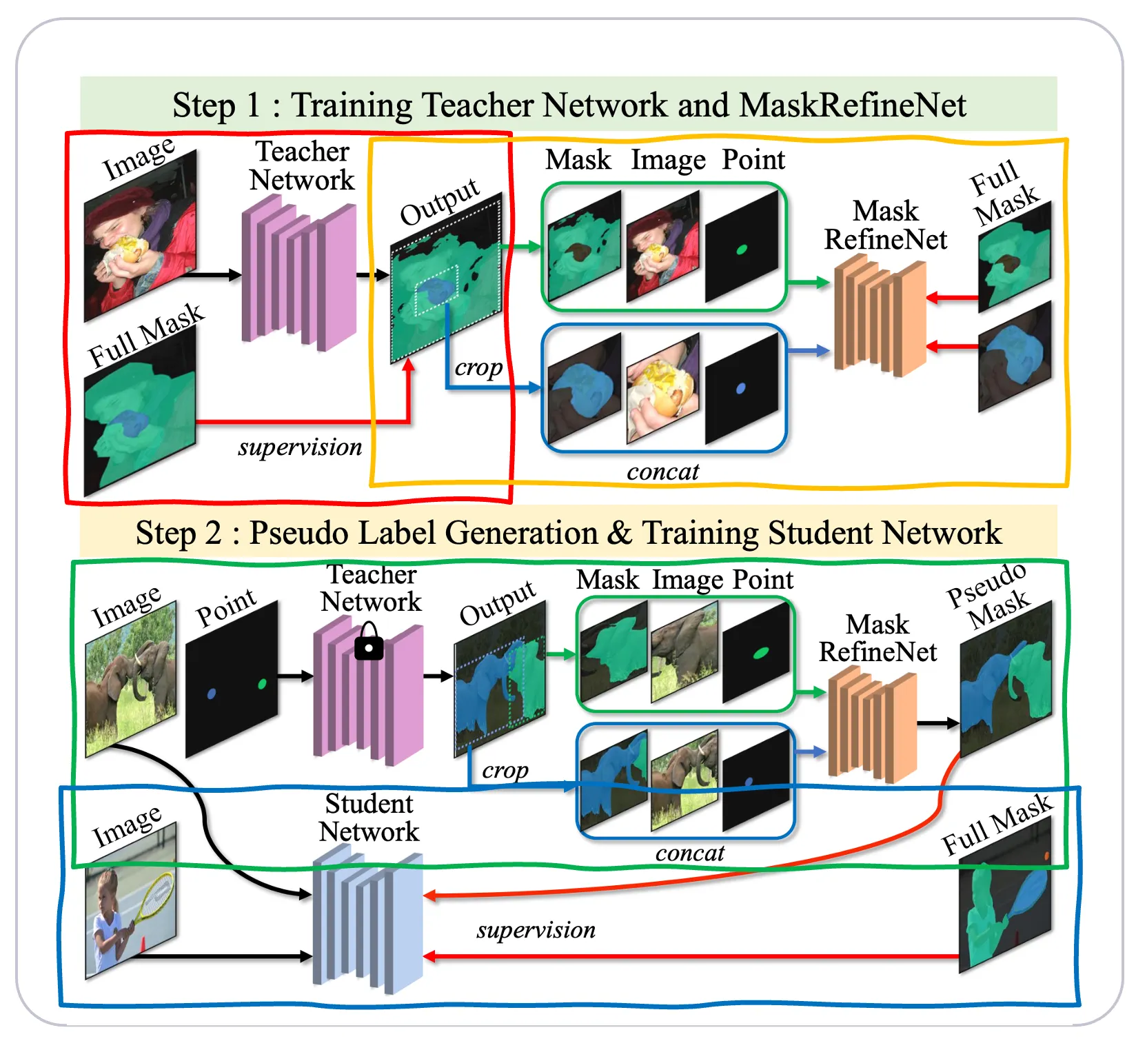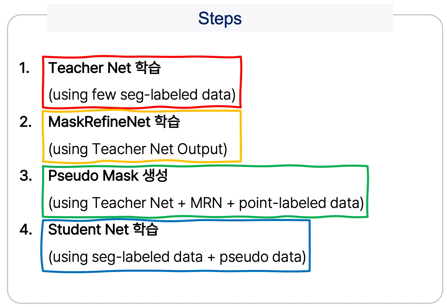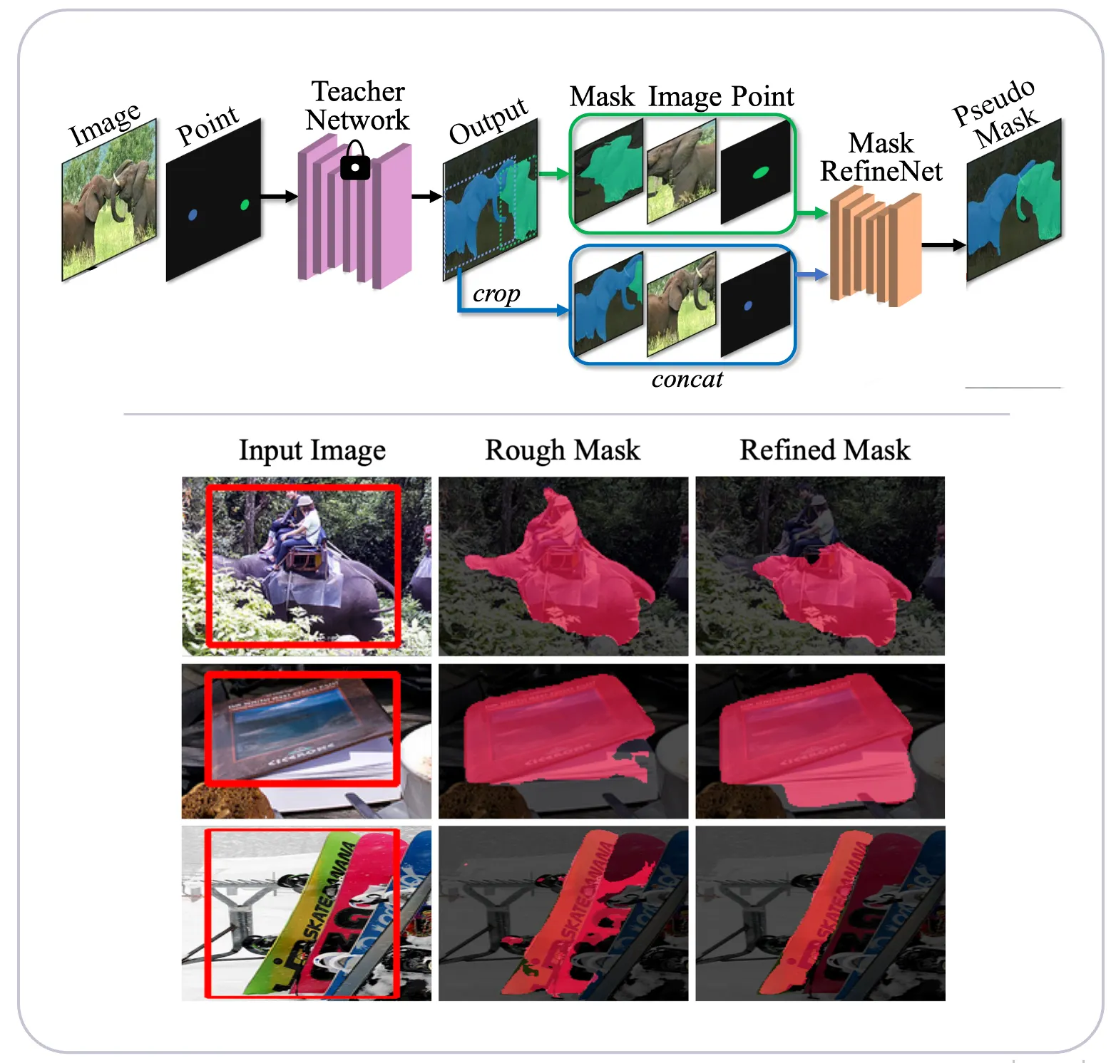 이 방법은 image, point와 teacher network가 예측한 rough mask의 세 가지 소스를 바탕으로, teacher network에서 생성한 rough 마스크를 개선합니다.