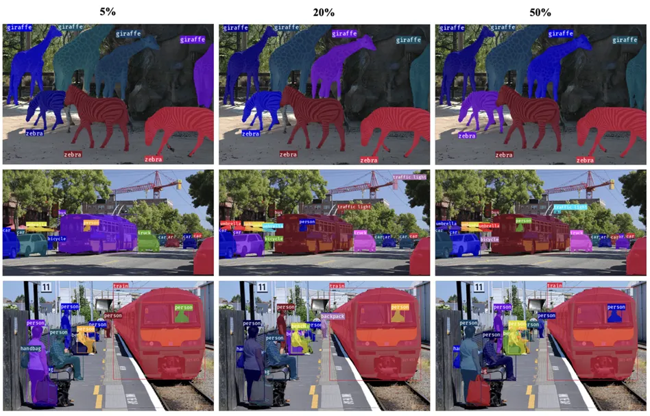 5% 미만의 fully-labeled dataset을 사용하는 상황에서도, 다양한 크기의 인스턴스를 적절히 분할할 수 있음을 나타냅니다.