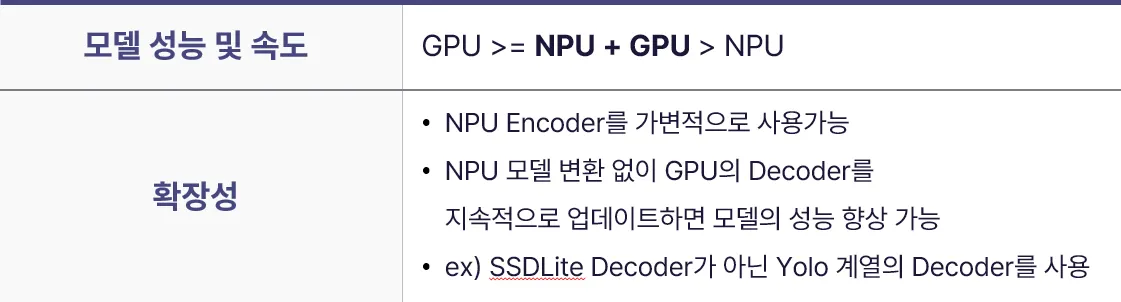 확장성 측면에서 NPU의 Encoder를 가변적으로 사용가능하며 NPU Encoder가 fix되면 GPU의 Decoder를 지속적으로 업데이트하여 모델의 성능 향상이 가능해집니다.
