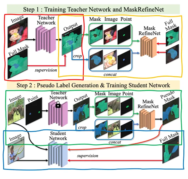 Teacher Net 학습 → MaskRefineNet 학습 → Pseudo Mask 생성 → Student Net 학습의 순서로 진행됩니다.